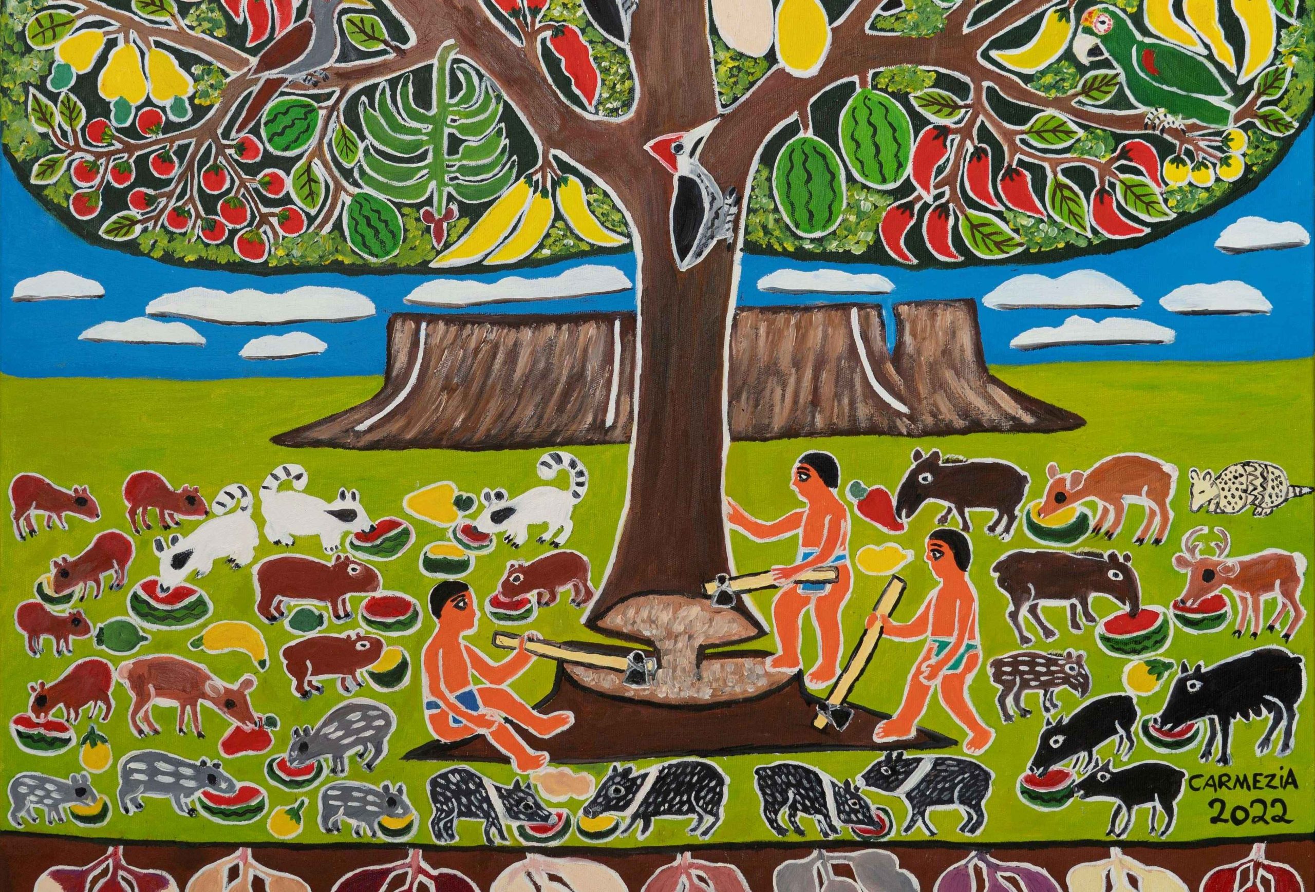Artista indígena pioneira no cenário brasileiro contemporâneo, Carmézia Emiliano (Maloca do Japó, Roraima, 1960) trabalha com pintura desde a década de 1990. Sua obra se concentra em representações de temas da cultura macuxi: festas, danças e brincadeiras associadas ao cultivo e consumo da mandioca e a seu cotidiano, paisagens com lagos, pássaros e outros animais, com destaque para o monte Roraima. Os macuxis habitam a região fronteiriça entre a Venezuela, a Guiana e o Brasil, e são mais de 30 mil só em nosso país, onde vivem na Terra Indígena Raposa Serra do Sol, cenário de embates com o garimpo ilegal. Na pintura de Emiliano há muitos detalhes intrincados, interconectados e ritmados que compõem extraordinários retratos de uma sociedade comunitária dotada de uma forte consciência ecológica.